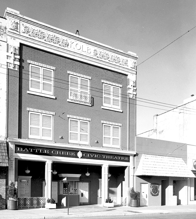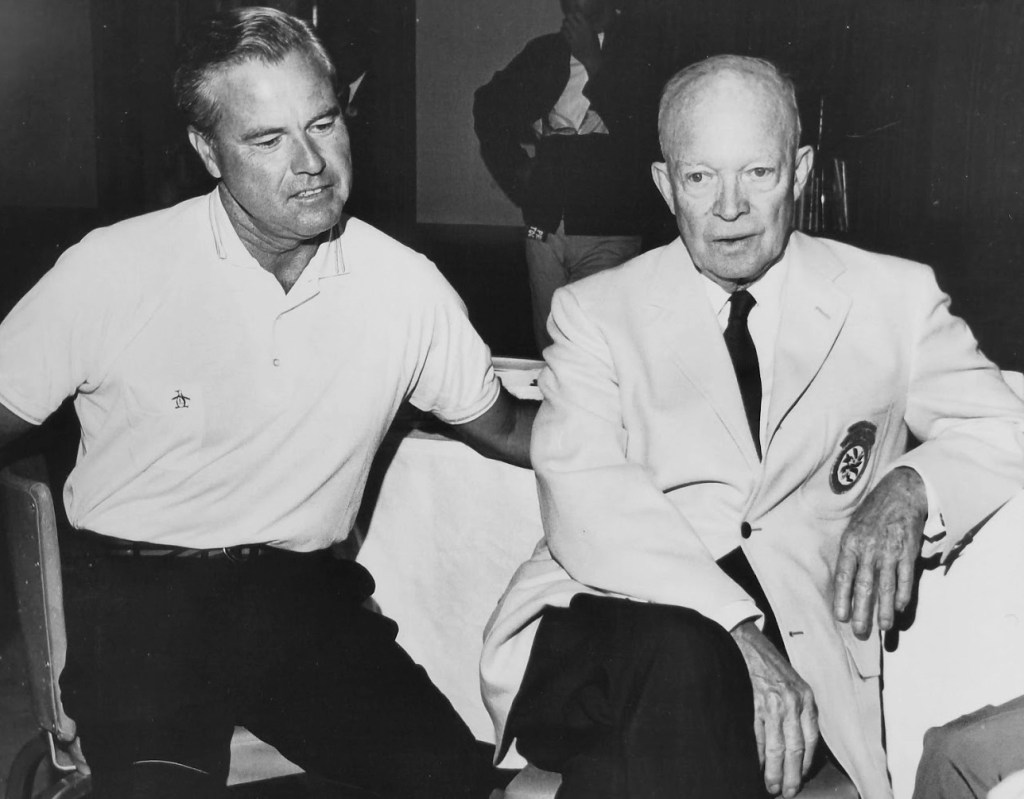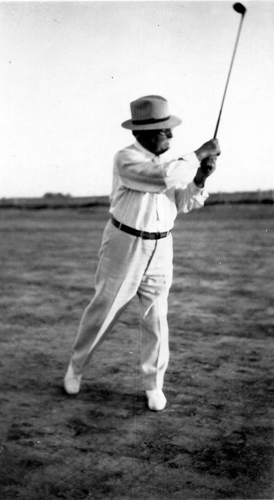 From the MSU archives – this photo was taken on #15 fairway looking toward #4 green just over the hill, probably in the mid 40’s.A good photo of Willie Park jr, architect of the course.This uncaptioned photo at the end of the book is of Dr. John Harvey Kellogg trying out the new links. Winter photo from the driveway of 1CCD taken toward #2 Tee, probably in the late ’30s.Renovating the Strand Movie theater as the new home of the Battle Creek Civic Theater – my early non-golf related project, courtesy Dave Couch.A better photo on the interior of the Battle Creek Civic Theater, courtesy of Dave Couch.Chick Harbert and Ike, in the ’50s probably after Chick captained the winning Ryder Cup team. One Country Club Drive in the year 2000, like we remember it. Andy and Rena Peck